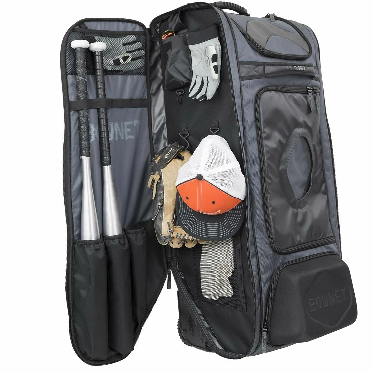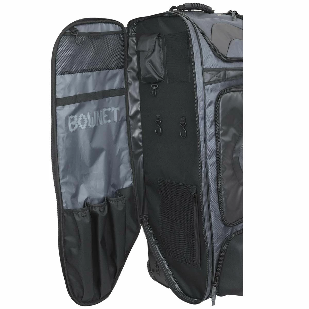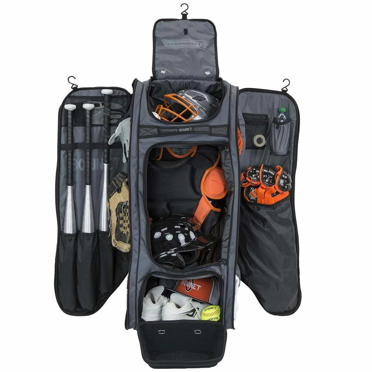 The Bownet Commander wheeled catcher’s equipment bag is designed for travel ball, high school and adult catchers who need the ultimate catcher’s bag. Measuring 38” H x 17” W x 12 D”, the Commander features 14 different pockets to store and carry all of your catcher’s gear including bats, uniform, helmet, jackets, and accessories, all in one bag. The Commander’s durable Big Trax™ wheels are equipped with rubber treads for quiet easy transport over grass, gravel or road. 3 big barrel full size bats fit on the side bat panel pocket. The Commander is outfitted with a molded semi-hard case for your helmet or cleats. Top it off with a removable personalization panel for your name, number or team name.