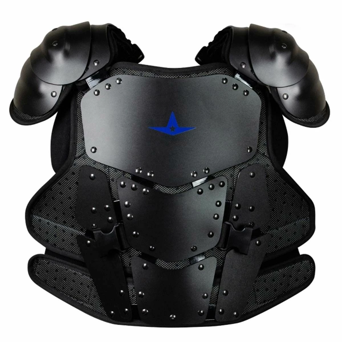 The All-Star Cobalt umpire chest protector features a low-profile countoured hard shell that uses 3.7mm thick HDPE pre-curved armor plates with hinges to conform to any body shape. The pre-curved shoulders allow this chest protector to hang on, and not slip down, for superior collarbone protection. A removable extension feature is included that adds another 3.5″ of seamless protection for taller officials. The shoulder guards can move outward by 1/2 inches for larger officials. A removable shoulder gap cap allows for an even lower profile fit. The armor plates can be bent and formed to your own desired custom shape. A patented central cooling channel with removable and washable chest pads also allows you to swap in a dry set for a long day of tournament games. The DeltaFlexβ’ harness has hookups in the front for easier on/off.
