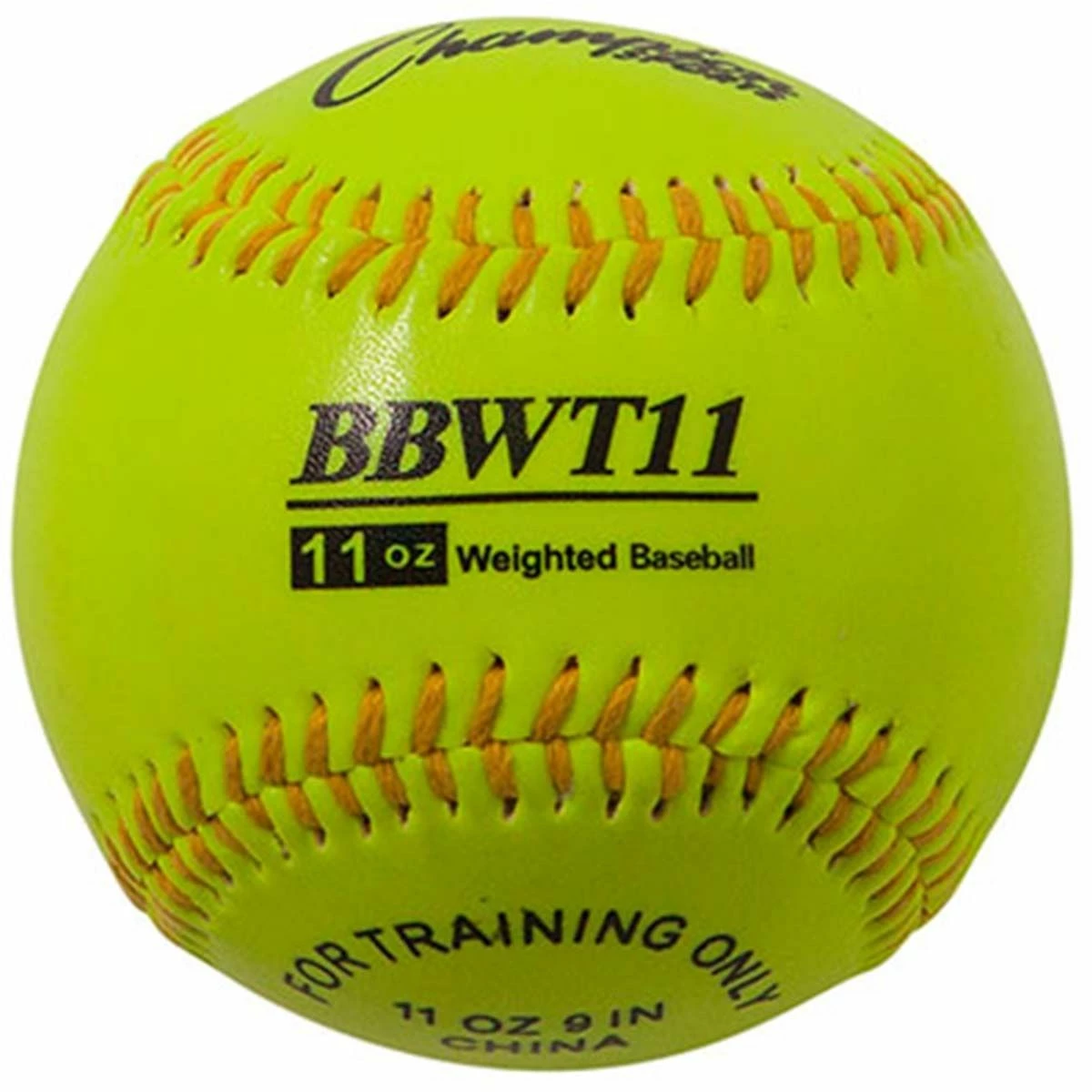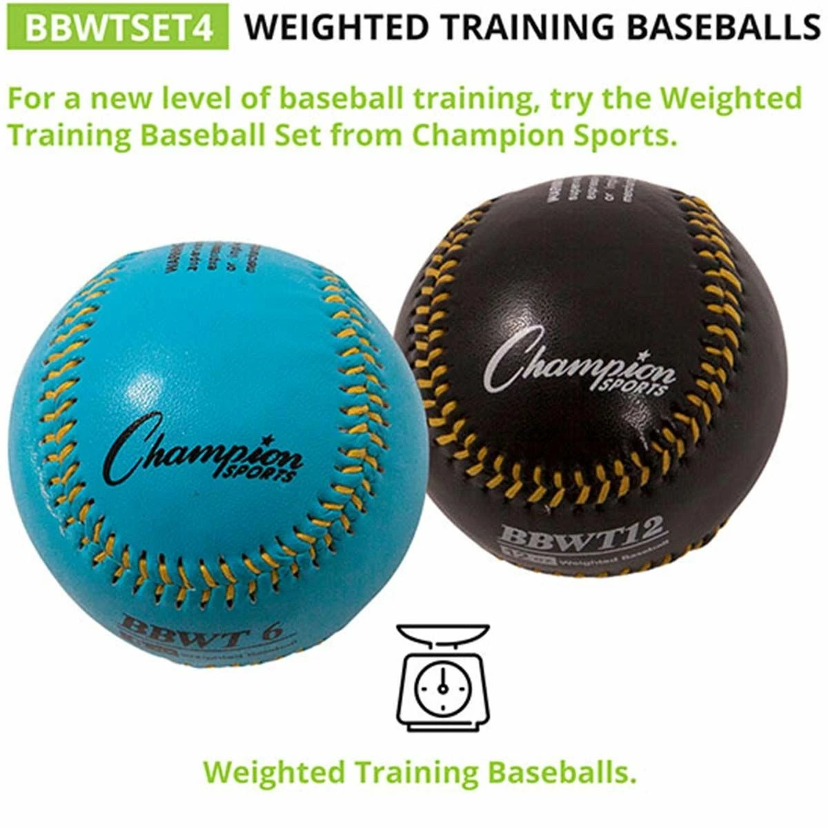 Strengthen your arm with these weighted training baseballs from Champion. These weighted baseballs have the same feel as a regular baseball and weigh from 9-12 oz. Use these weighted training baseballs for pitching to increase your velocity on the mound. Each set comes with 4 color-coded weighted balls. These training balls have a leather cover with rubber and cork core and include a mesh carrying case.