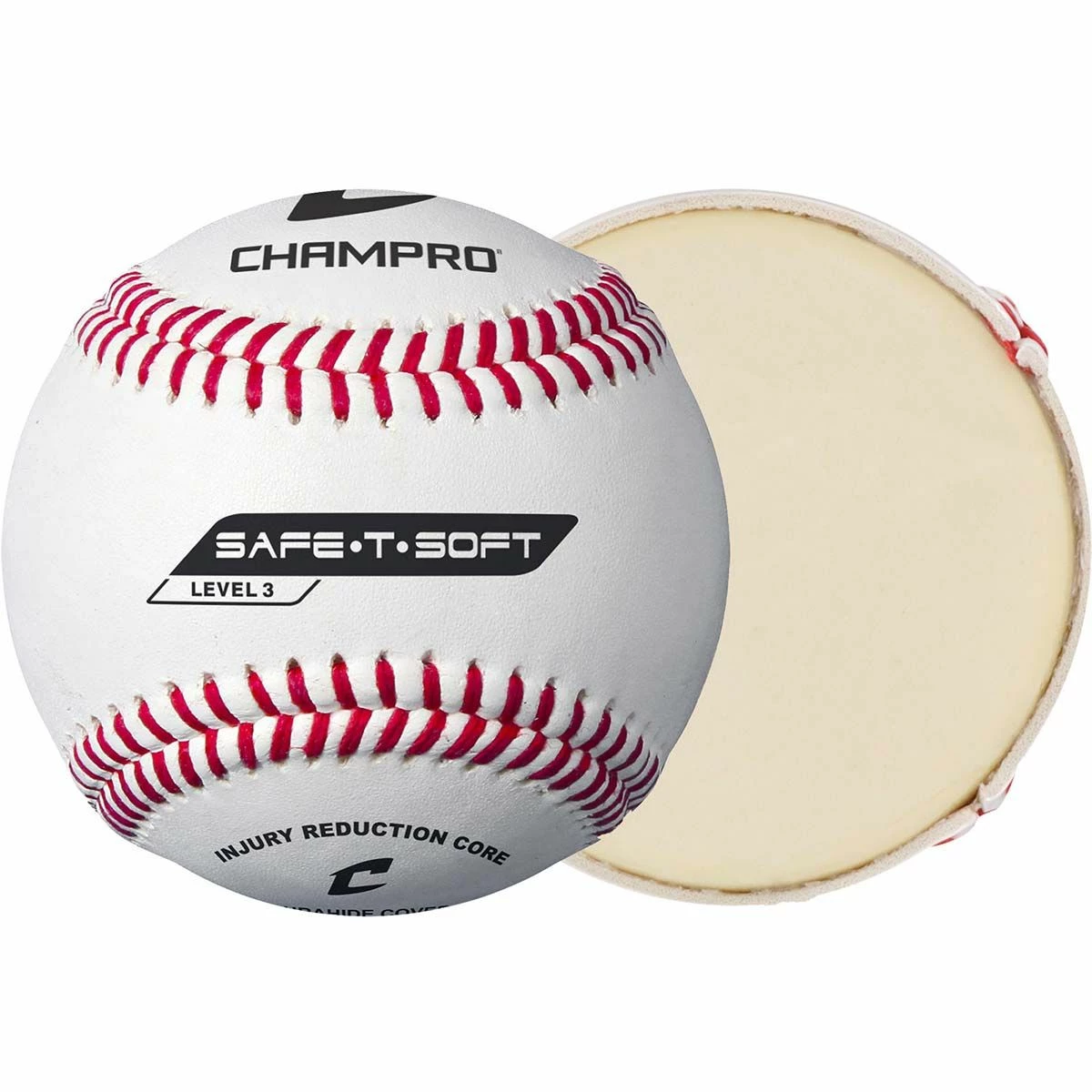 The SAFE-T-SOFT practice baseball from Champro is softer than a standard baseball to reduce the possibility of injury when hit. The solid foam rubber core and synthetic durahide cover make this safety baseball ideal for indoor practice or t-ball play. The SAFE-T-SOFT reduced injury baseball is offered in three safety levels, from tee ball up to high school play.