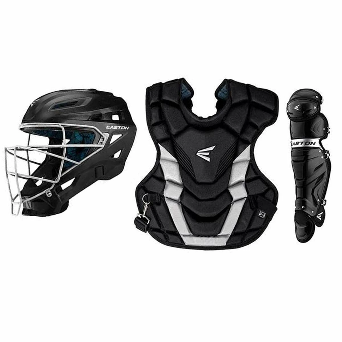 The Easton Gametime adult catcher’s gear box set includes a Gametime catcher’s helmet, chest protector, and leg guards. The Gametime catcher helmet fits hat sizes 7-1/8 – 7-1/2, and features an improved steel cage designed for maximum visibility, an ABS plastic shell with strategic air flow vents, comfort stacked foam with a Biodri moisture wicking fabric liner that will keep you cool behind the plate. The Gametime helmet meets the NOCSAE standard for catcher’s helmets. The Gametime adult chest protector measures 17″ and features impact absorbing foam ab padding for better rebound control, an adjustable shoulder cap, a 4-point webbing strap system for a tight fit, a heavy-duty steel inset waist clip for a better wrapped fit, and meets the NOCSAE Commotio Cordis chest protector standard. The Gametime adult leg guards measure 16.5″ and feature a reinforced knee system that improves fit and security when moving in and out of the squat, a wide-set knee design that provides a larger surface area in the blocking position, and a vented shell with breathable EVA foam liner for increased air flow and breathability.