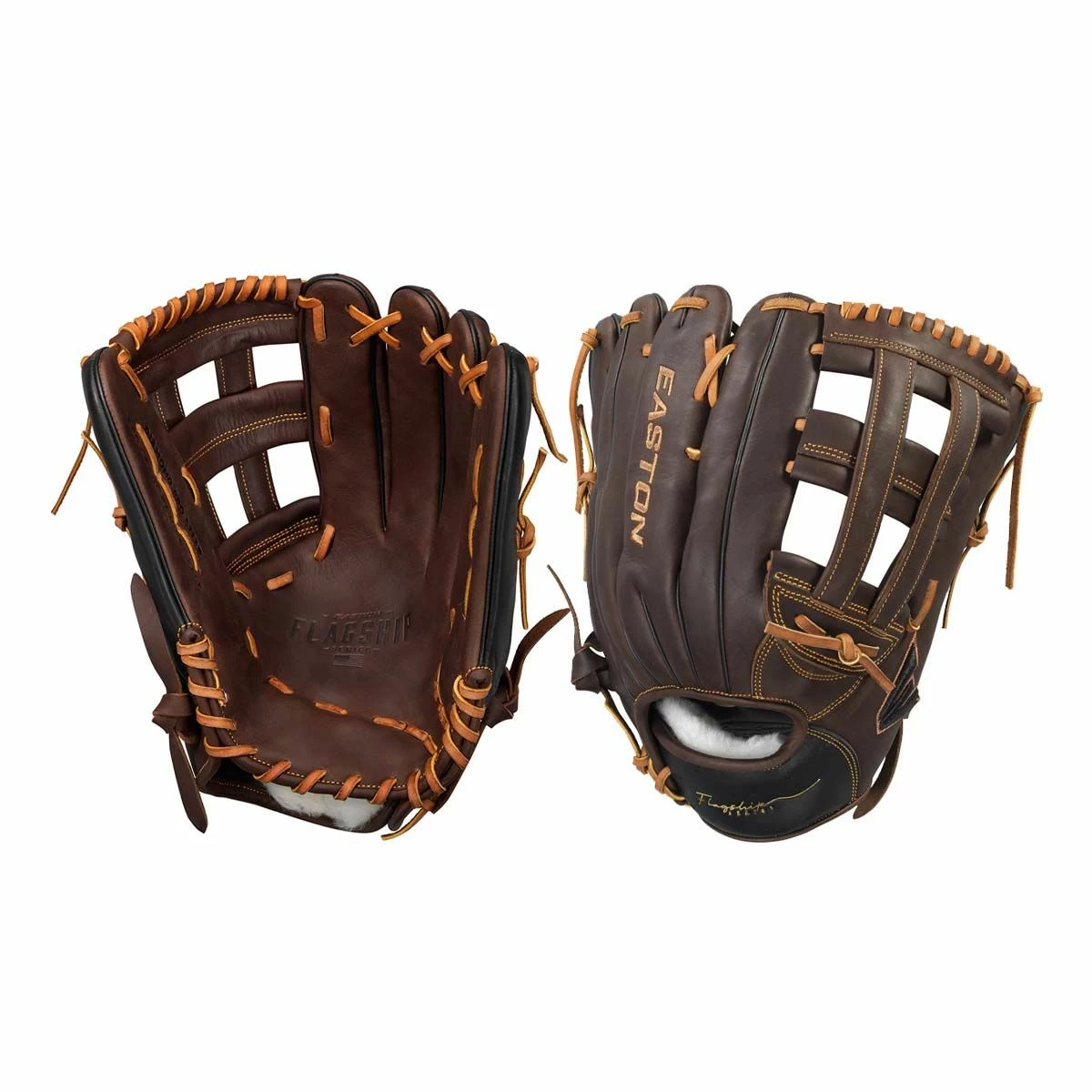 The Easton FS-L73 12.75β Flagship Series baseball glove features an outfield pattern and a H-web design for either right hand throw or left hand throw outfielders. This glove is crafted out of a Diamond Pro Steer leather shell thatβll give you a pro-level fit and feel. The classic cowhide palm lining and finger stalls provideΒ ultimate comfort that lasts the whole game. Eastonβs Flagship Series gloves are made to last with their professional-grade USA-tanned rawhide lace, tested to a tensile strength of 100 lbs. with steer hide binding for increased durability. With comfort in mind, the pinkie loop has been repositioned to allow for two fingers in the pinkie stall as well as a luxurious sheep wool shearling fur in the wrist liner.