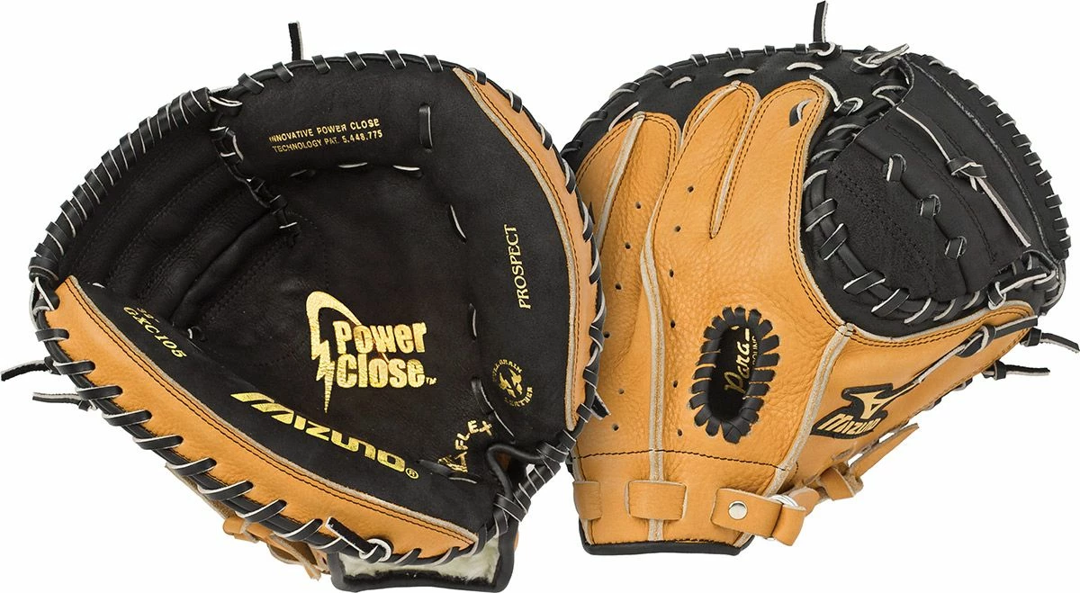 The Mizuno GXC105 Prospect series catcher’s mitt is specifically designed for youth players. Mizuno offers multiple technologies which make it easier for younger players to close the glove and learn to catch the ball the right way. The Prospect features a ParaShock palm pad that provides less rebound and less sting. Power Close technology helps young players close the glove and is intiated by the V-Flex closure system.