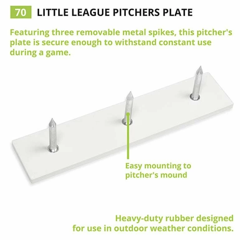 This official youth league pitcher’s plate is an economical solution for your ball field. Β Three metal spikes are included to hold it down securely and the rubber can easily be removed or replaced.