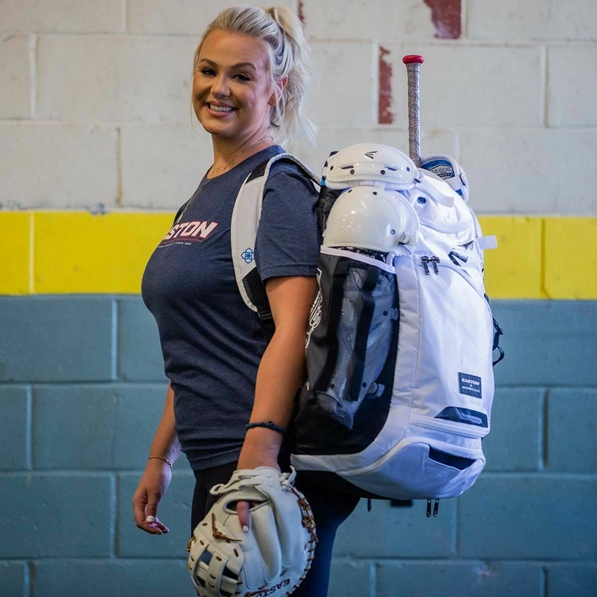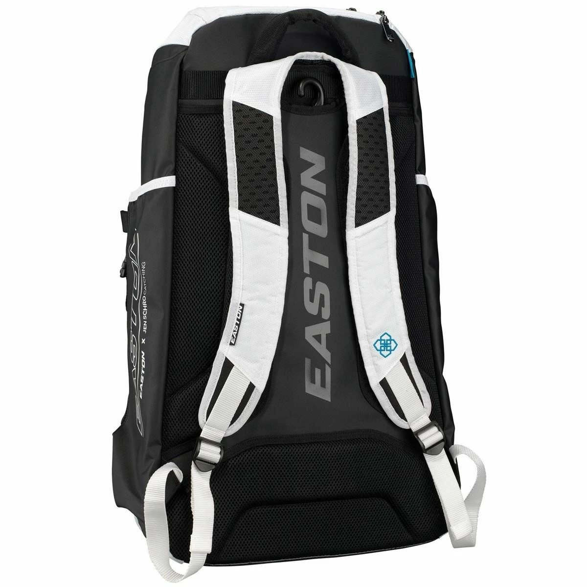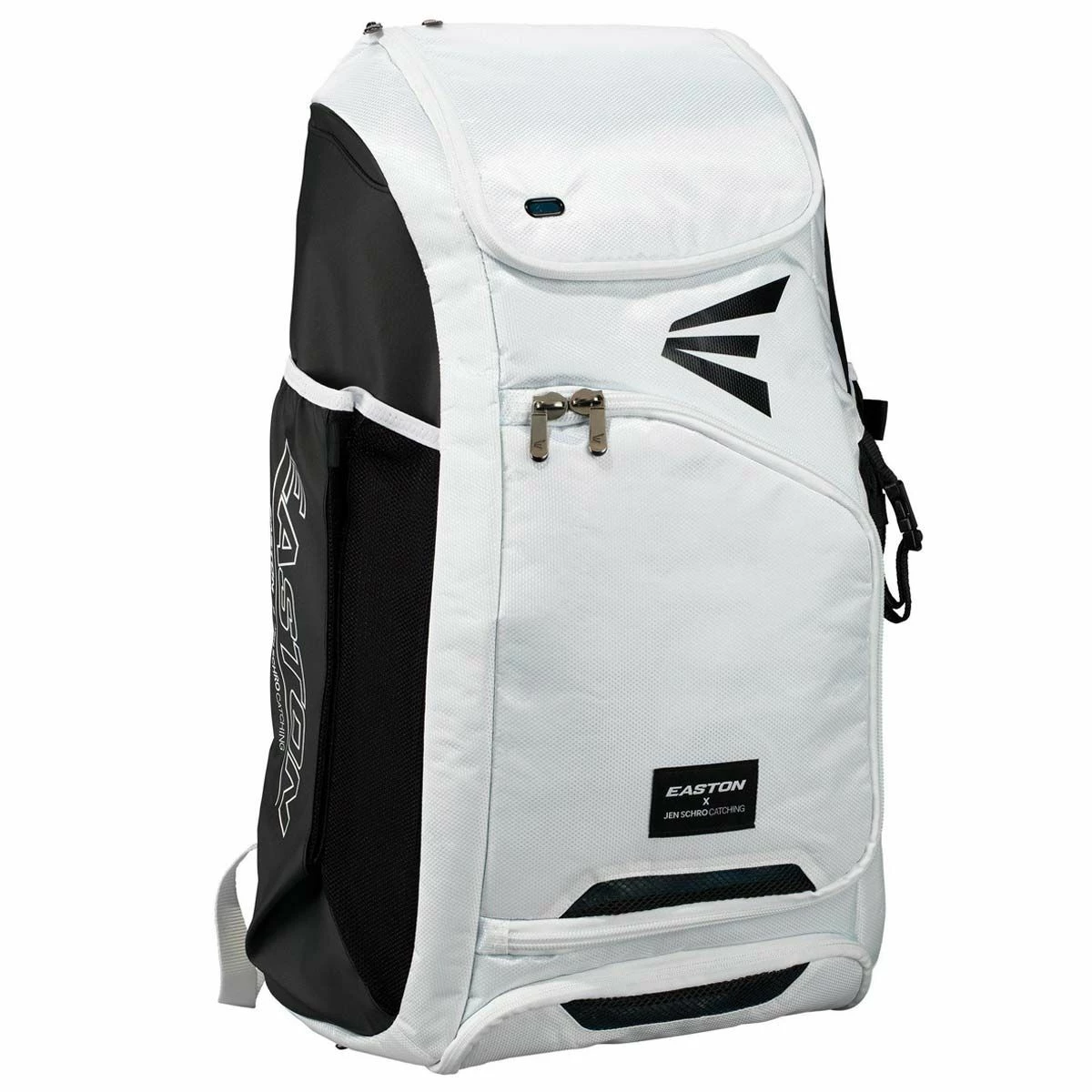Easton’s E700CBP Jen Schro catcher’s backpack was built to hold all of your catcher’s gear and necessities for a day at the field. This backpack features a large vented main compartment to fit a full set of catcher’s gear, an interior shelf to keep gear organized, as well as a separate vented shoe compartment. The bag also features fastpitch catching star Jen Schroβs inspirational messaging throughout the interior lining and Easton X Jen Schro Catching lockup on the outside. Side mesh sleeves hold leg guards when in tow, and can be folded and secured out of the way when not in use. The external strap and buckle on the front are ideal for attaching your ball glove or batting helmet. Since we know you’re so much more than just a catcher, this bag also features two fully-lined bat sleeves.