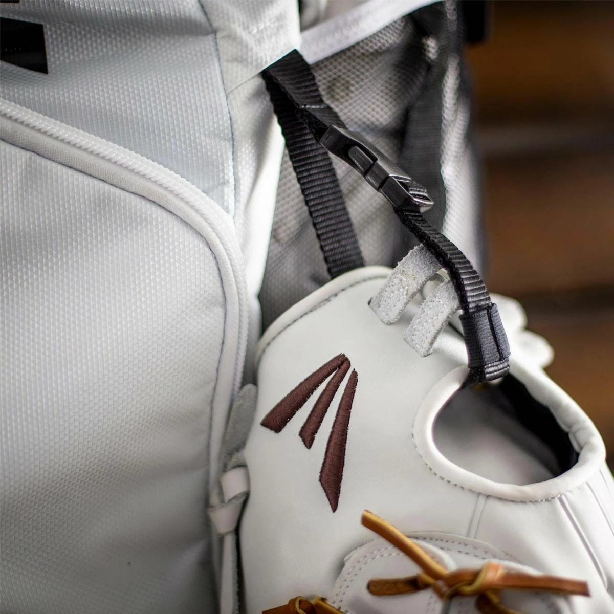 - External strap & buckle attaches helmet or ball glove