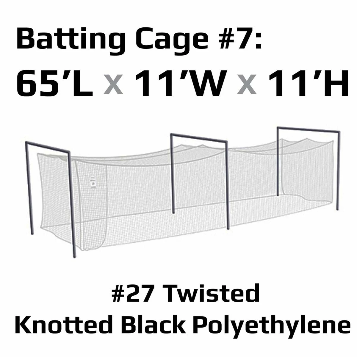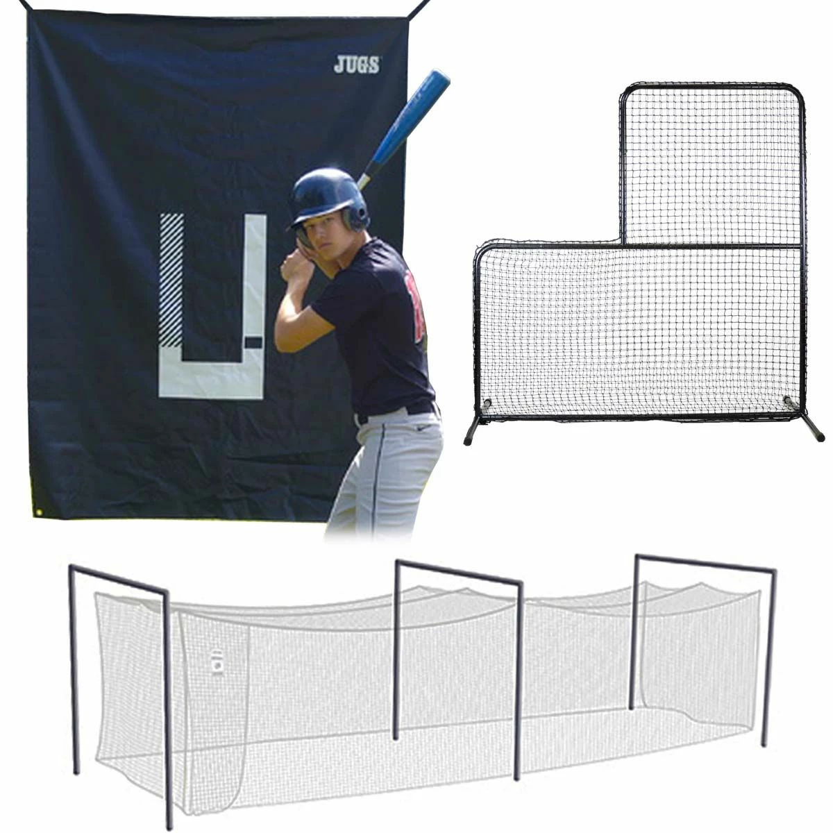 The Jugs baseball backyard batting tunnel net package allows you to have batting practice and perfect your swing in the comfort of your own backyard. This package includes an outdoor batting cage frame and polyethylene net measuring 65βL x 11βW x 11βH, a standard L-shaped protective screen to keep the pitcher safe, and a hanging backdrop to replicate the strike zone. The included twisted knotted black polyethylene netting is easily hung on the cage frame and is designed specifically for baseball and softball use. Knotted nets have a higher overall strength and durability rating making them superior for direct impact sports like baseball and softball. Twisted netting has a higher abrasion resistance than braided, because twisted has less surface area than braided. The polyethylene netting doesnβt absorb water, making it perfect for wet or humid hot climates. No permanent construction is required for the batting cage frame. The cage quickly dismantles simply unhooking the turnbuckles to lower entire cage to the ground.
