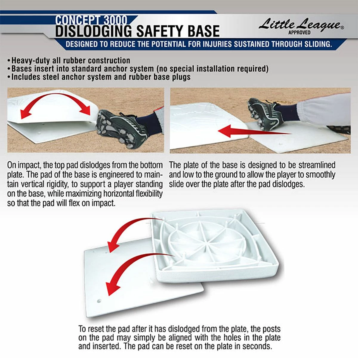 The dislodging double first base from Champro is designed to reduce potential injury for sliding injuries and allow umpires to make calls as the play progresses. The heavy-duty all rubber pad is strong enough to support a player standing on the base, but flexes and dislodges from the smooth bottom plate as players slide in. Within seconds, the top pad can be reset back onto the bottom plate when the play is complete. The 15″ x 30″ double first base features a white base for fielders and a bright orange base for baserunners to reduce injury from collisions. This base includes a steel double anchor system and 2 base plugs and is compliant with Little Leagueยฎ rule 7.15.