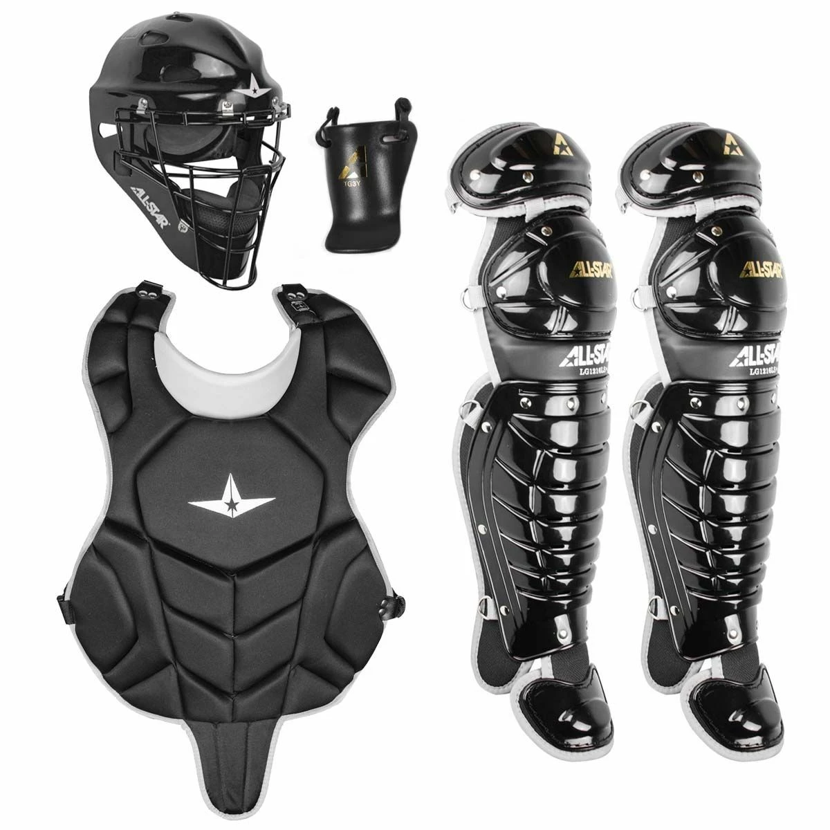 The All Star League Series age 9-12 catcher set is a great starter kit for the young baseball catcher. This kit includes an MVP2310 hockey style helmet, a CP912LS lightweight chest protector designed for maximum mobility, and LG912LS double knee leg guards with high impact resistant plastic for superior protection. The MVP2310 catcher’s helmet is made from tough ABS plastic construction, dual density foam liner, and I-BAR VISION steel cage. The CPCC912LS chest protector features a contoured neckline with throat padding, an internal PE protective plate in the sternum area, and segmented padding for great fit and easy movement for the player. The CPCC912LS chest protector is also equipped with heart guard hardware that meets the NOCSAE commotio cordis chest protector standard. The LG912LS leg guards feature a double-knee design, full wing wrap-around padding including ankle padding, and traditional straps for easy on/off and great mobility. The kit also includes a throat guard that attaches to the face guard for added protection behind the plate.