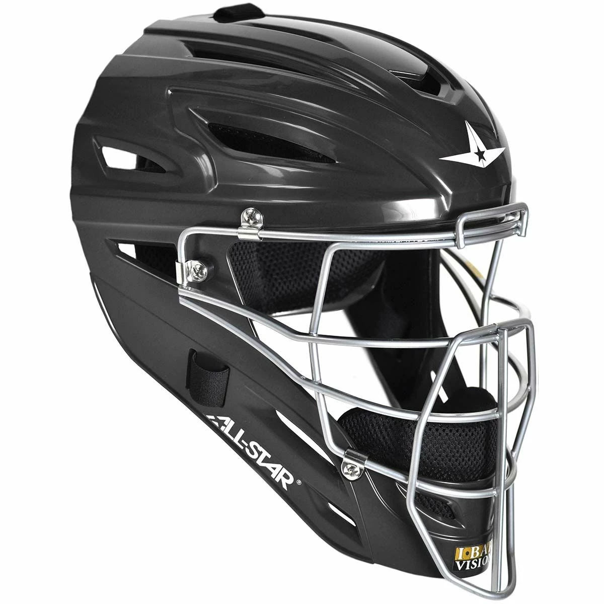 The All Star MVP2500 Catchers Helmet is part of the new System Seven design and concept. The System Seven design features include; innovation, perfect fit, style, durability, results, feedback and performance and can all be found in the MVP2500. The helmet’s face guard features a redesigned shell, cage, and padding system. The All Star catcher’s helmet has a Shell molded out of an impact resistant ABS resin and it also has a removable and machine washable UltraCool mesh liner. The MVP2500 also has an I-Bar Vision steel cage that deflects direct impacts away from a catcher’s head. With a strong center bar on the cage and its wedge shaped design, balls that target your face guard will bounce off upon impact