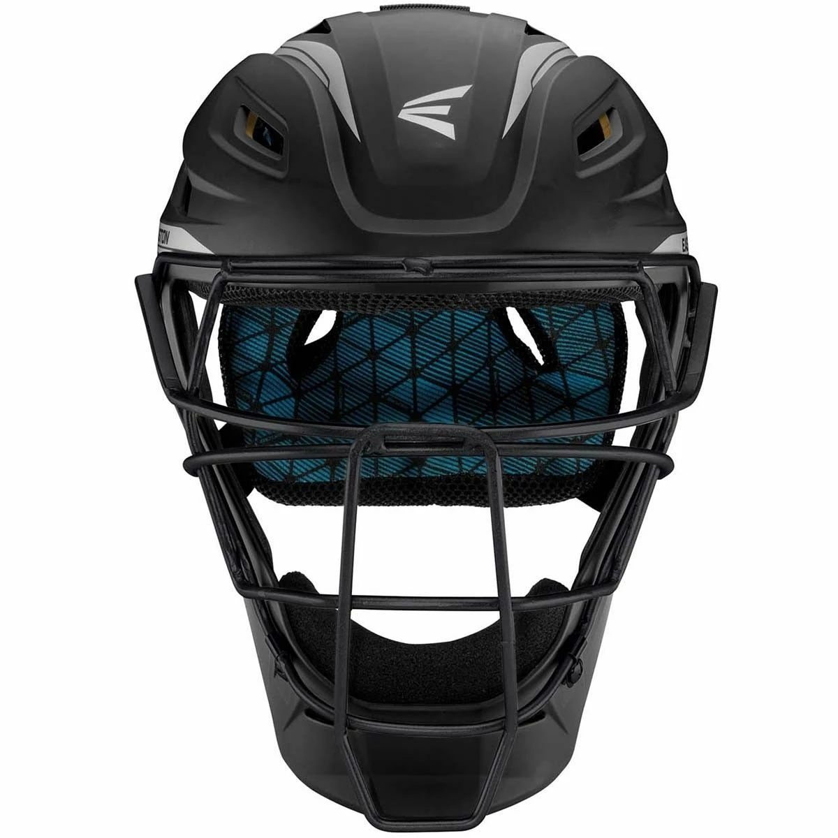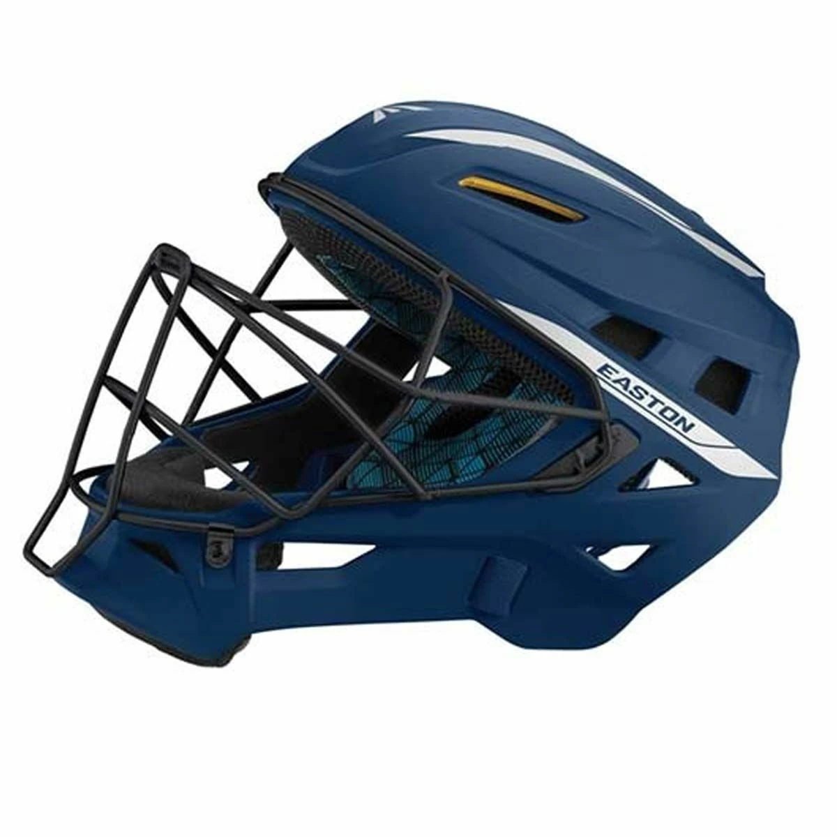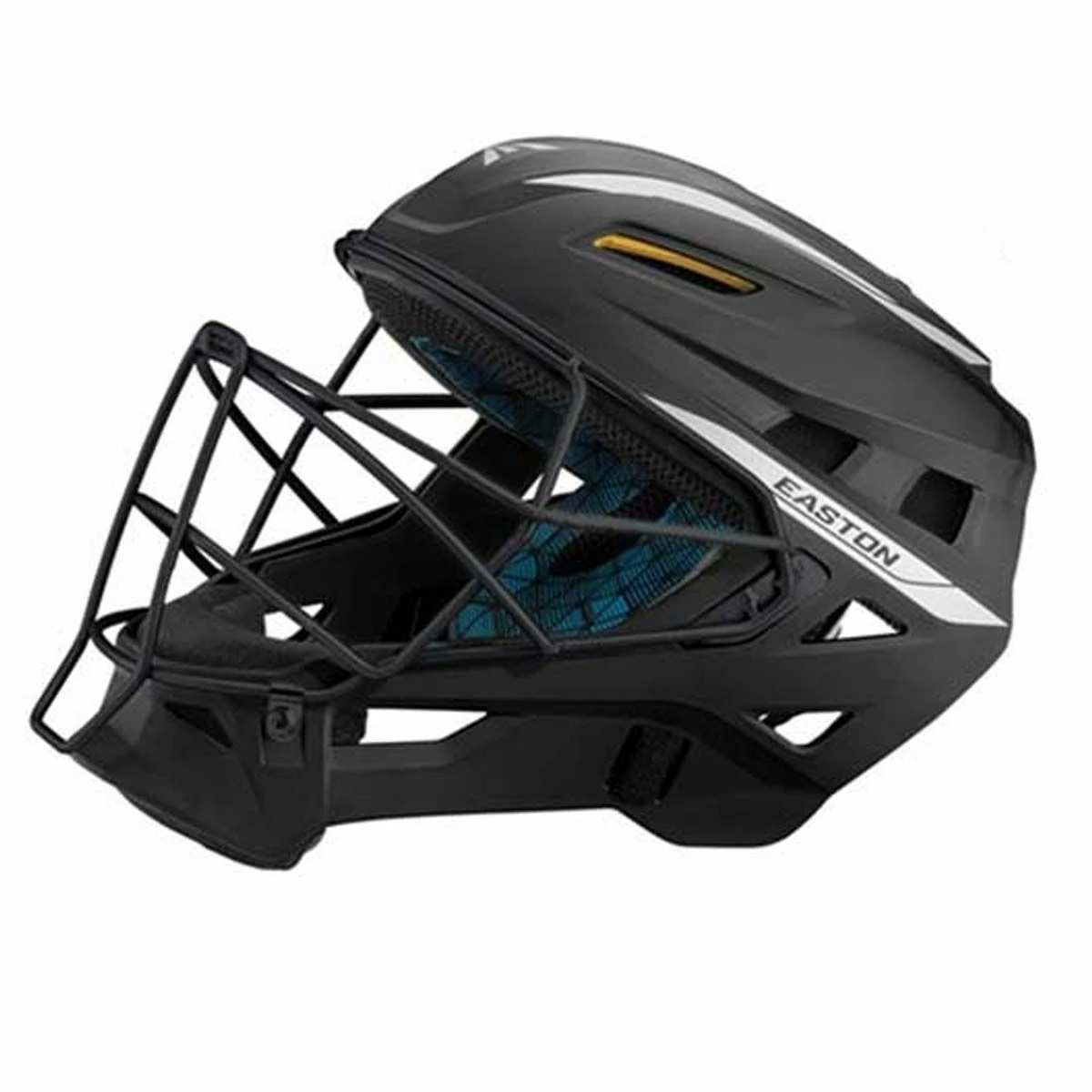 The Pro X catcher’s helmet is an industry best catcher’s helmet for a top level catcher. This baseball catcher’s helmet features a black steel cage with a flat middle bar for increased visibility. The ABS plastic shell has strategic air flow vents and the plush wrapped padding with breathable air mesh and BioDri moisture wicking fabric liner that will keep you cool behind the plate on gameday. The ergonomic chin cup design allows for better fit and communication with your pitcher. The Easton catcher’s helmet meets the NOCSAE standard for catcher’s helmets.