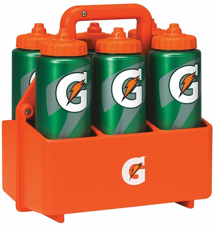 This sturdy plastic carrierΒ has a convenient molded handle and holds six 32 ounce Gatorade squeeze bottles (sold separately)