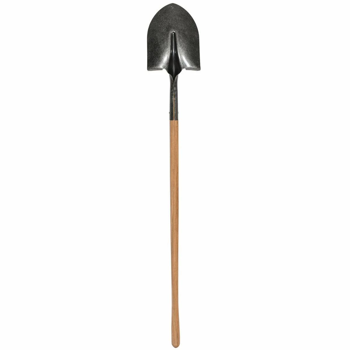 The pit shovel is made out of tempered steel and has a round point head.