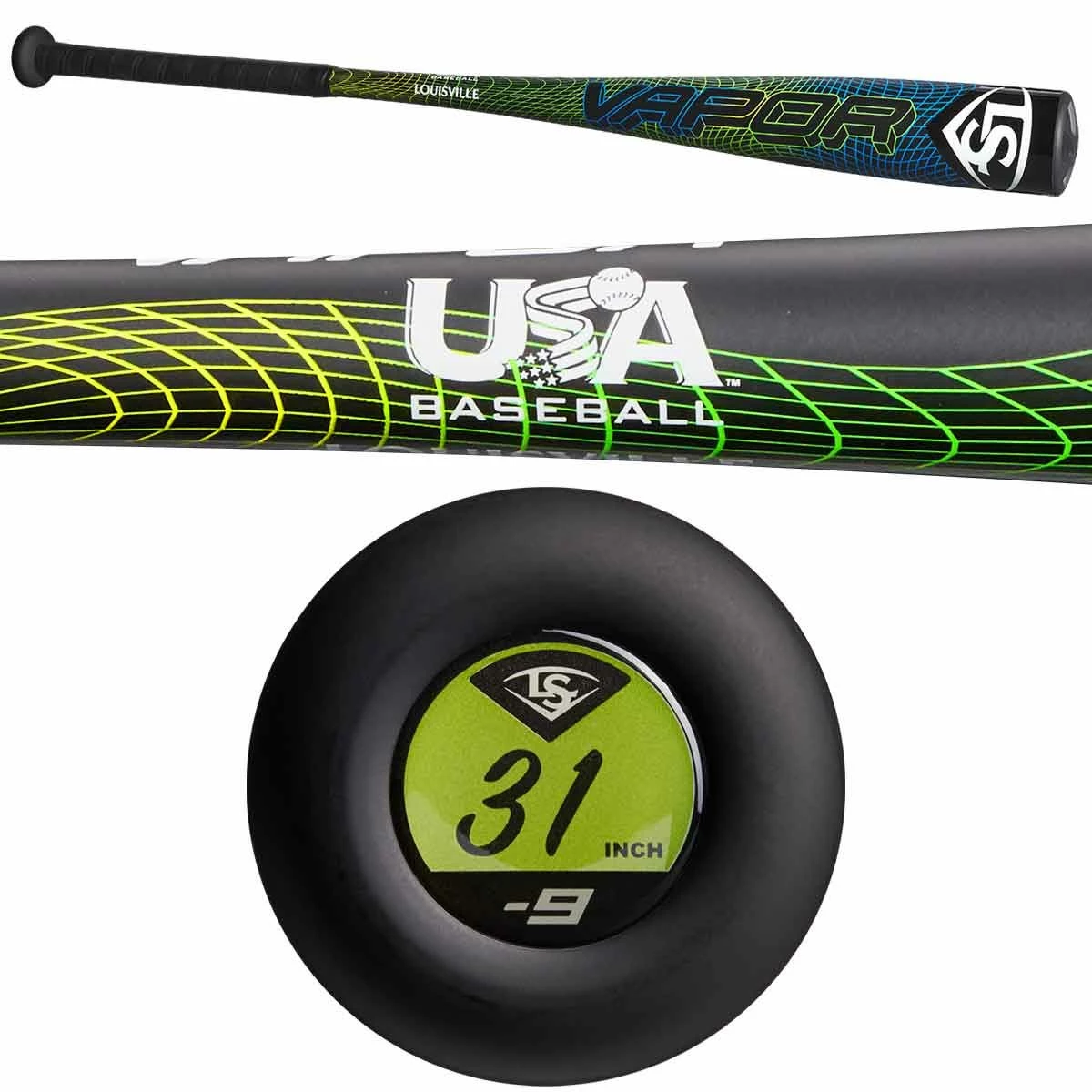 The 2022 Louisville Slugger Vapor youth baseball bat features a Series 7 premium aluminum alloy barrel, a stff 1-piece construction, and a HUB™ 1-shot end cap to deliver durability and performance. The 2-5/8″ big barrel design maximizes plate coverage and success in the batter’s box. The Vapor’s -9 length-to-weight ratio, synthetic leather grip and balanced swing weight help optimize bat control for a level swing. The Vapor -9 youth baseball bat is USA Baseball certified and is backed by a 1 year manufacturer’s warranty against defects.