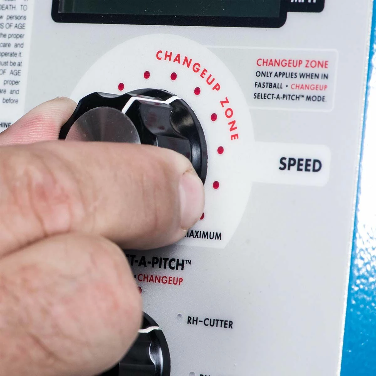 - Select-A-Pitch™ dial throws fastballs, changeups, split-finger fastballs. right/left-handed curveballs, sliders, and cutters