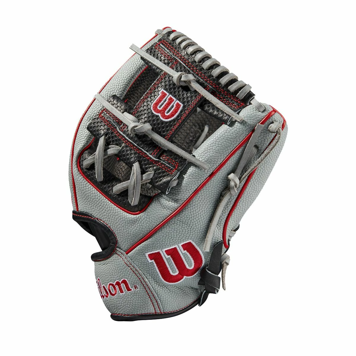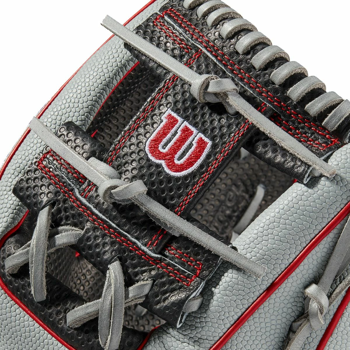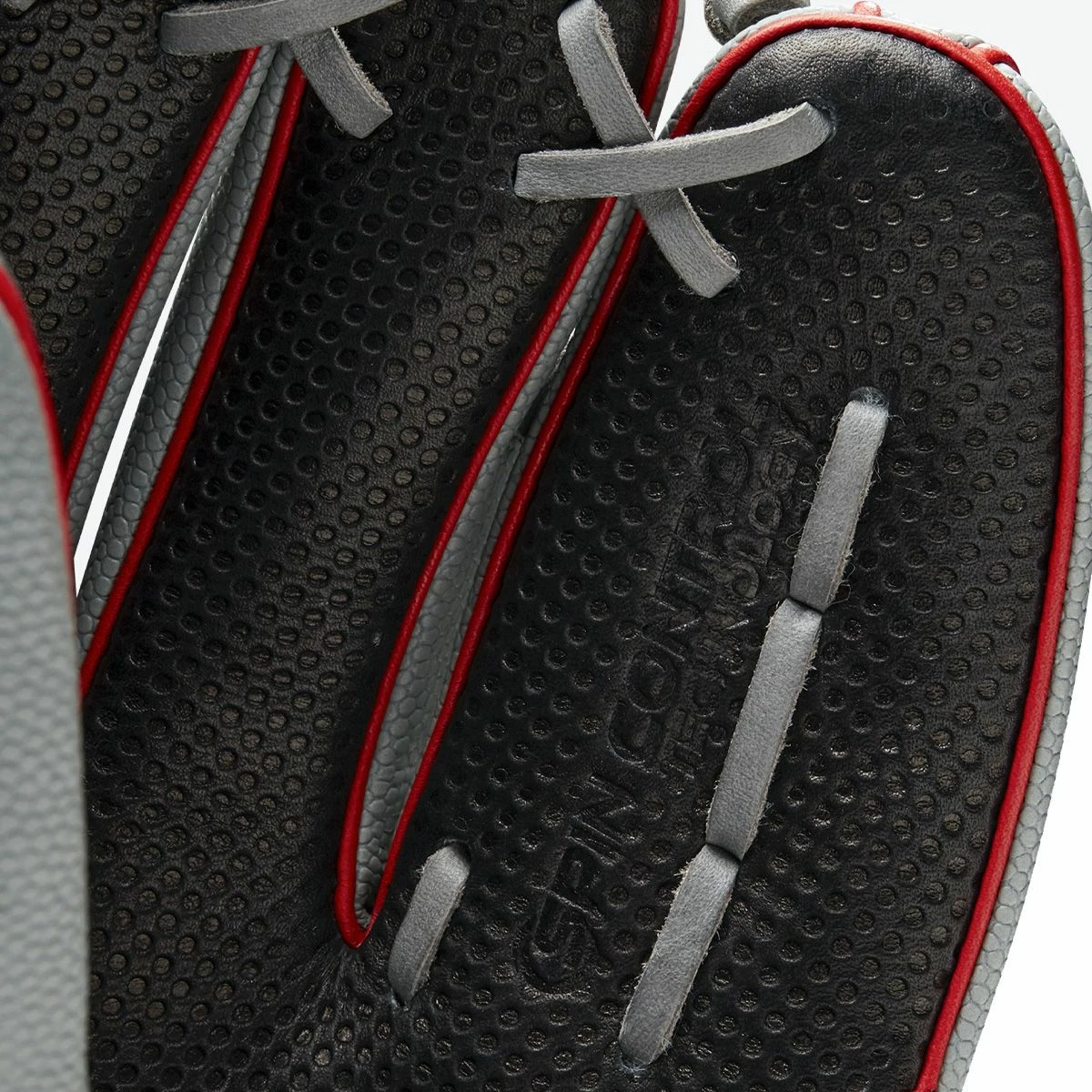 The Wilson A2000 11.75″ Spin Control baseball glove features a deeper pocket than most infielder’s gloves so that the fielder has the chance to get the best possible grip on the ball. This glove’s Spin Control technology and dimpled glove palm increase friction between a ball and glove, and the grey Superskin back reduces the weight of the glove, making it more advanced than other infielder’s gloves on the market.