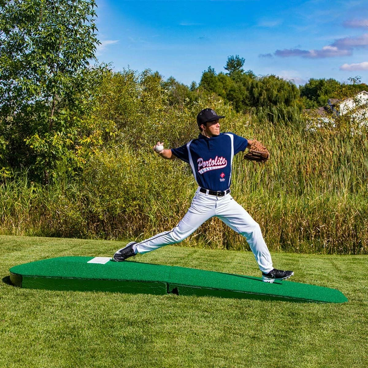 The Portolite oversize indoor/outdoor turf practice pitching mound features a two-piece design with interlocking sections that make transportation, set-up/breakdown, and storage easy. This oversize mound is designed for the tallest pitchers with long strides and extra “noisy” wind ups. This portable mound is ideal for batting practice, bullpens, athletic facilities and gymnasiums. Measuring 10″H x 10’L x 5’W, this mound features a full body, poly protected resilient core construction that gives pitchers a solid yet cushioned landing area to help reduce knee and ankle strain. This practice pitching mound features a larger back area to practice step-off pick off moves. The mound’s poly coating grips gym floors without scratching. The 10″H oversize mound is equipped with durable nylon AstroTurf with a simulated pitching rubber that lasts ten times longer than industry standards.