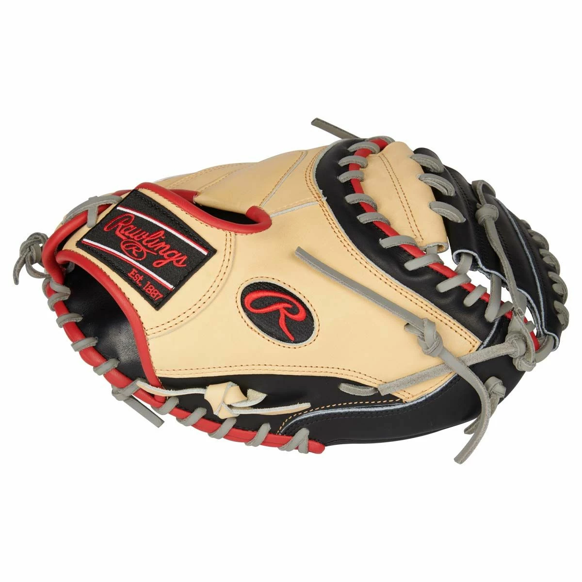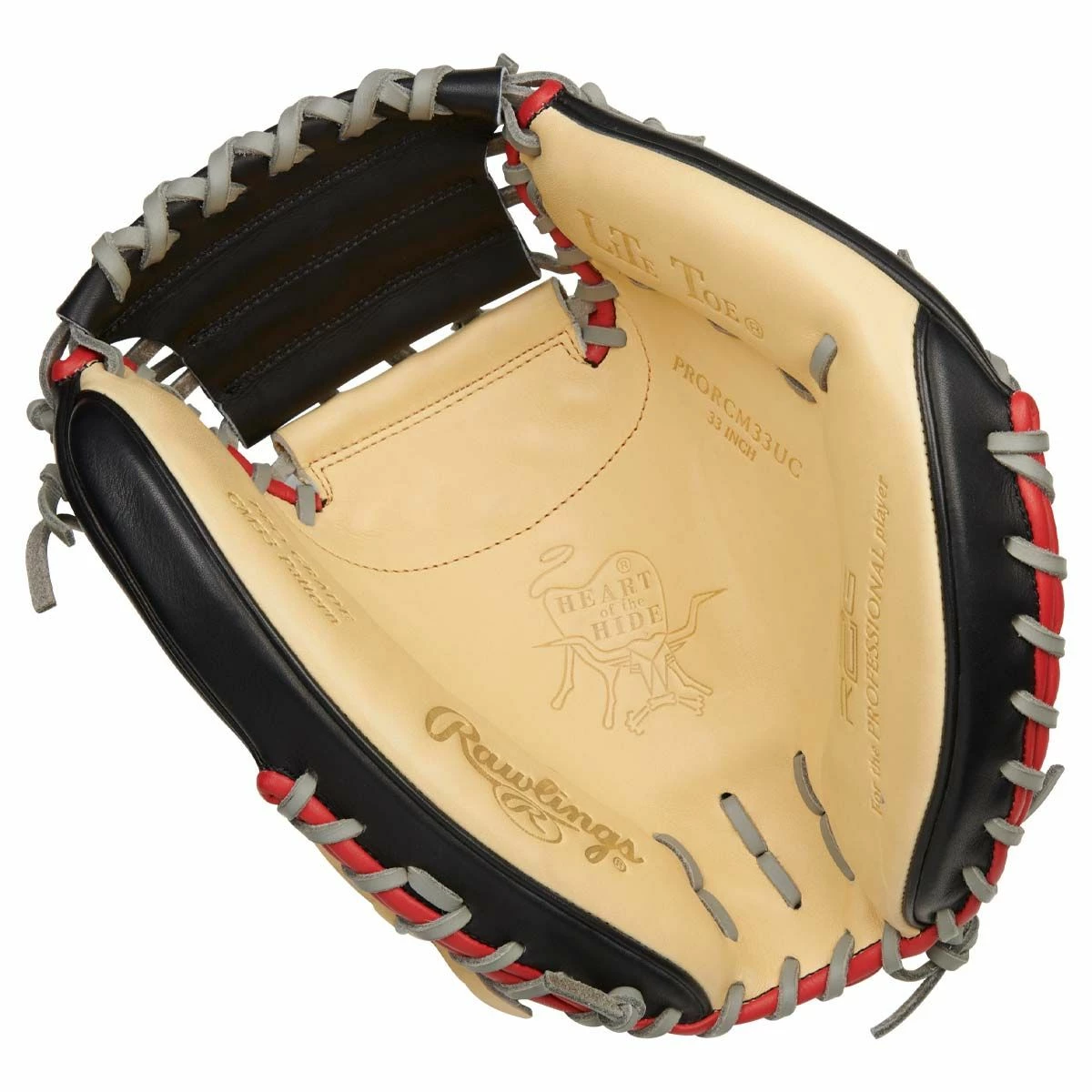 The Rawlings 33″ PRORCM33UC catcher’s mitt features a ContoUR Fit pattern that is specifically tailored to smaller, thinner hands. The ContoUR Fit offers a smaller wrist opening along with an adjusted back opening, making the finger pad reachable, improving control, and creating a custom-fit feel. This model is built with R2G “Ready 2 Go” Heart of the Hide leatherΒ that requires little to no break-in, making this mitt an ideal choice for serious younger players who may not have the hand strength, hand size, or time to break a glove in.Β The mitt’s top grade USA steer-hide leather construction, deer tanned cowhide palm lining, soft full-grain finger back linings, and padded thumb sleeve provide more durability, comfort, and a better feel than any other catcher’s mitt. The thermoformed hand opening will keep your hand cool and ventilated all game. This glove has a solid 1-piece web design and a CM33U pattern with a black and camel color. This Rawlings mitt comes 65% broken in and is constructed to handle the hardest fastballs along with the trickiest breaking balls. This 33″ catcher’s mitt will give you the very best protection, durability, and performance behind the plate.